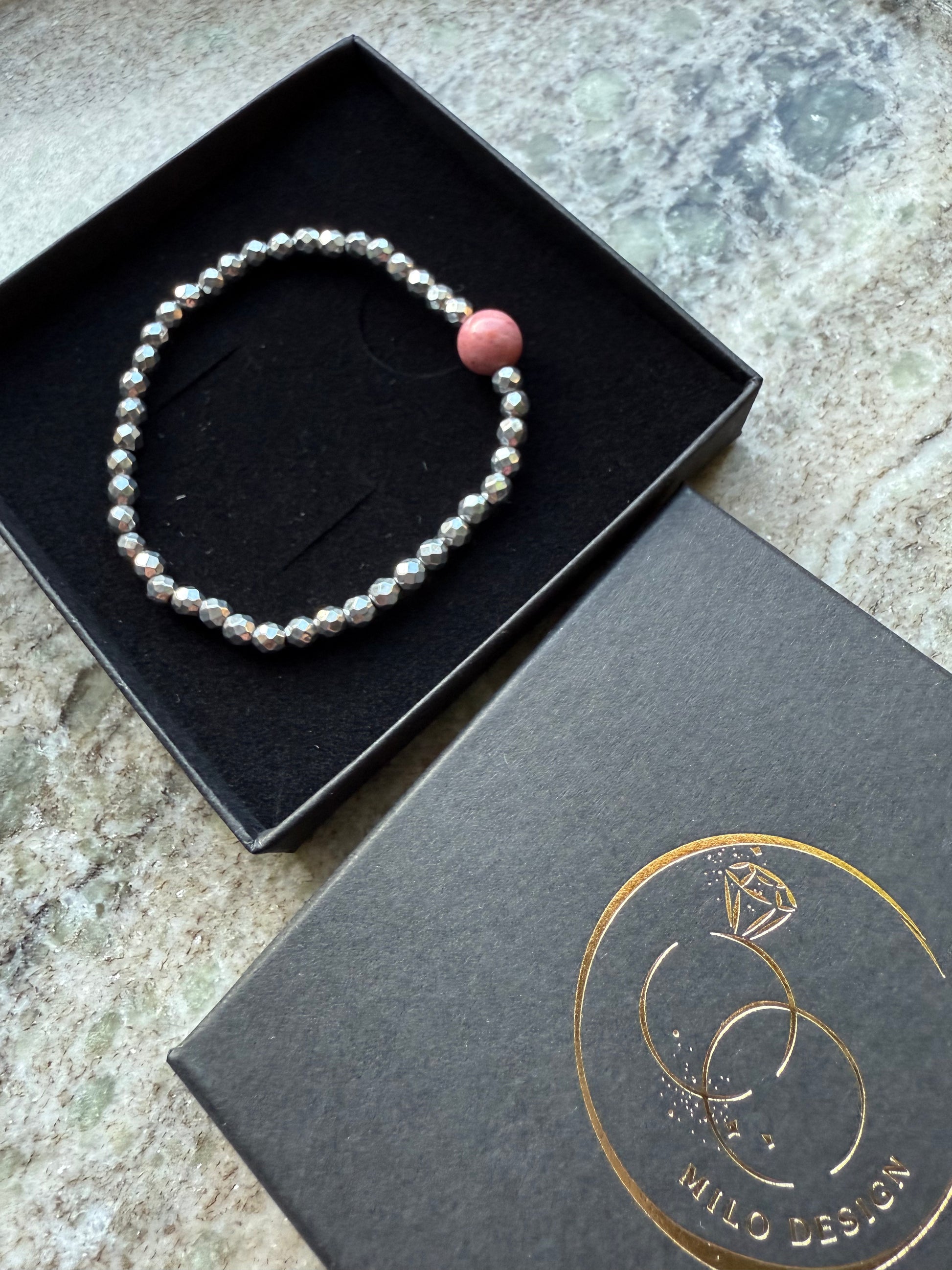 Elegancka, ręcznie wykonana bransoletka łącząca połyskliwe kulki hematytu w kolorze srebrnym z subtelną kulką rodonitu. Delikatny, a zarazem wyrazisty design sprawia, że doskonale komponuje się zarówno z codziennymi, jak i bardziej eleganckimi stylizacjami.
