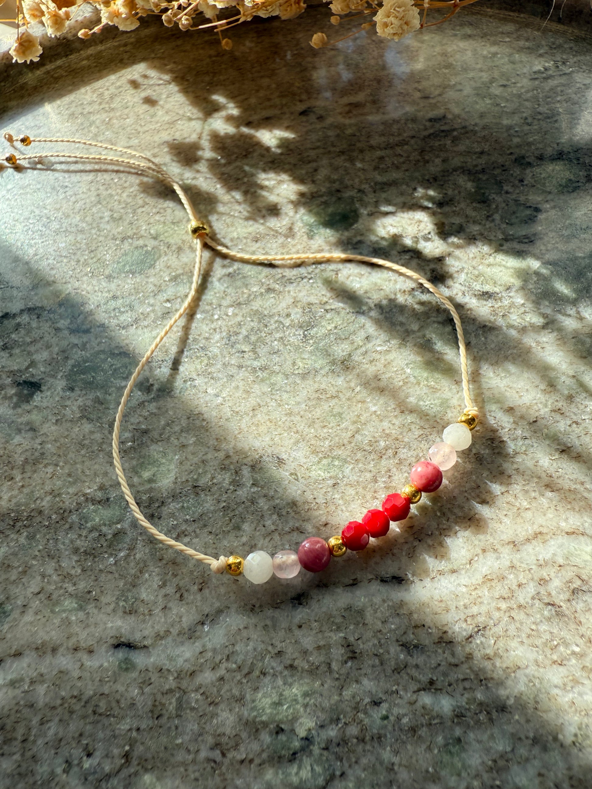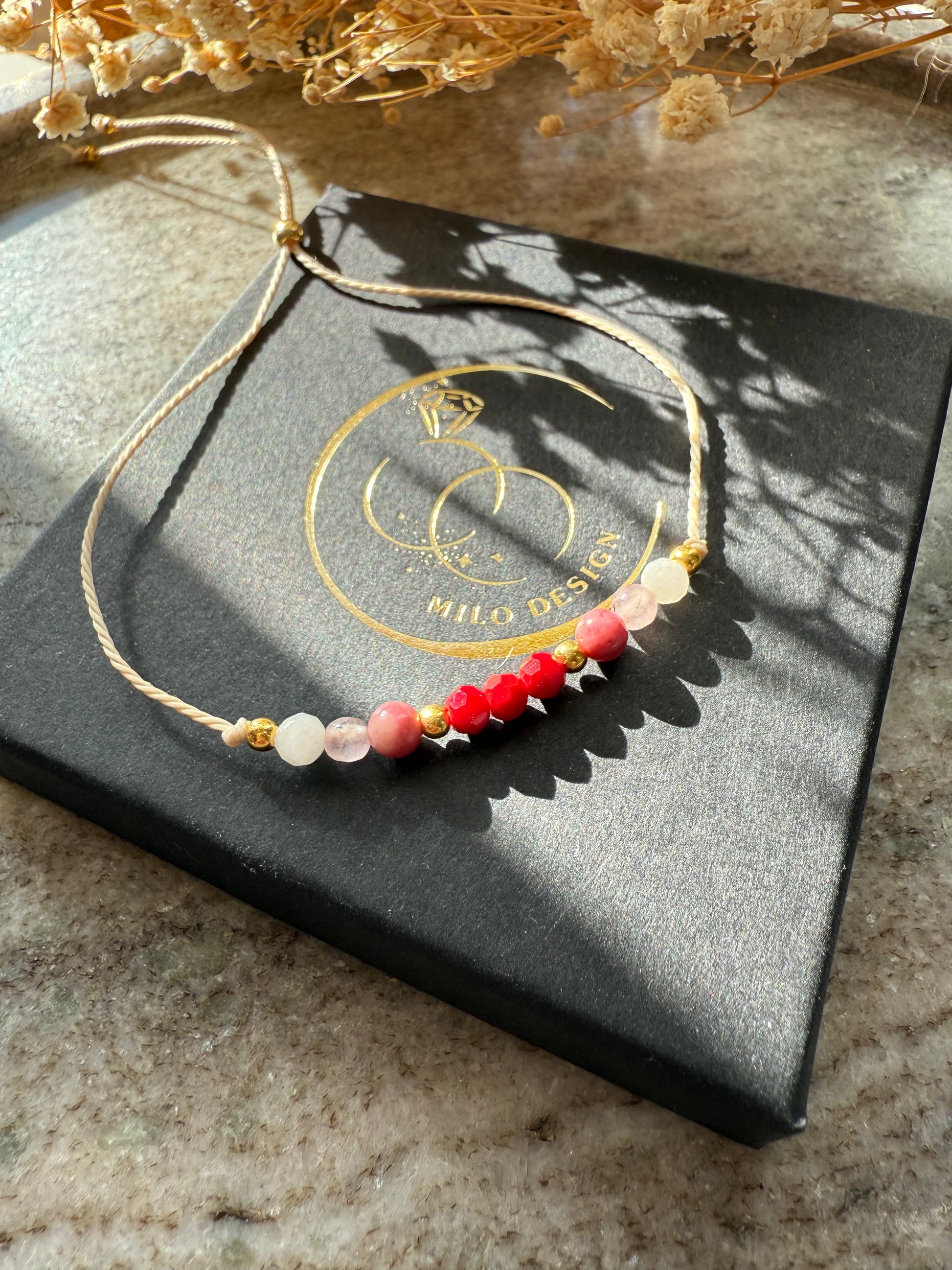 💓Bransoletka na sznurku z rodonitem, rubinem, kwarcem różowym, kamieniem księżycowym i złotym hematytem – Miłość, kobiecość i wewnętrzna równowaga