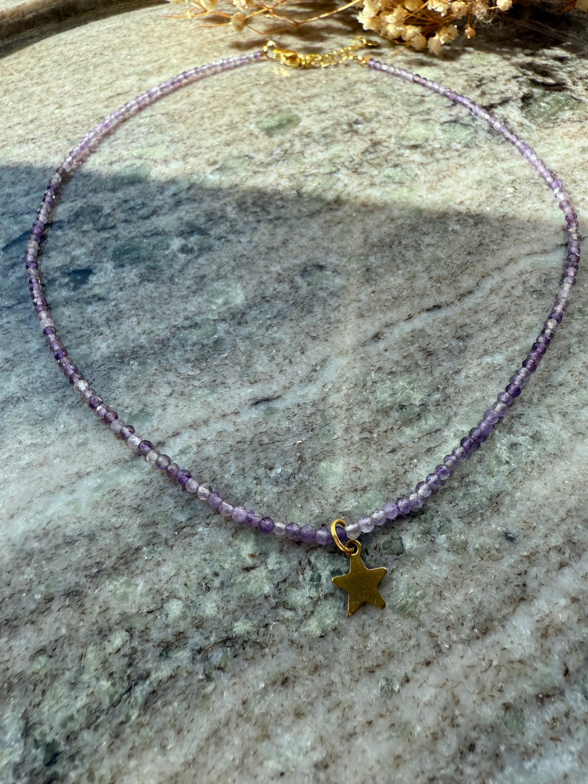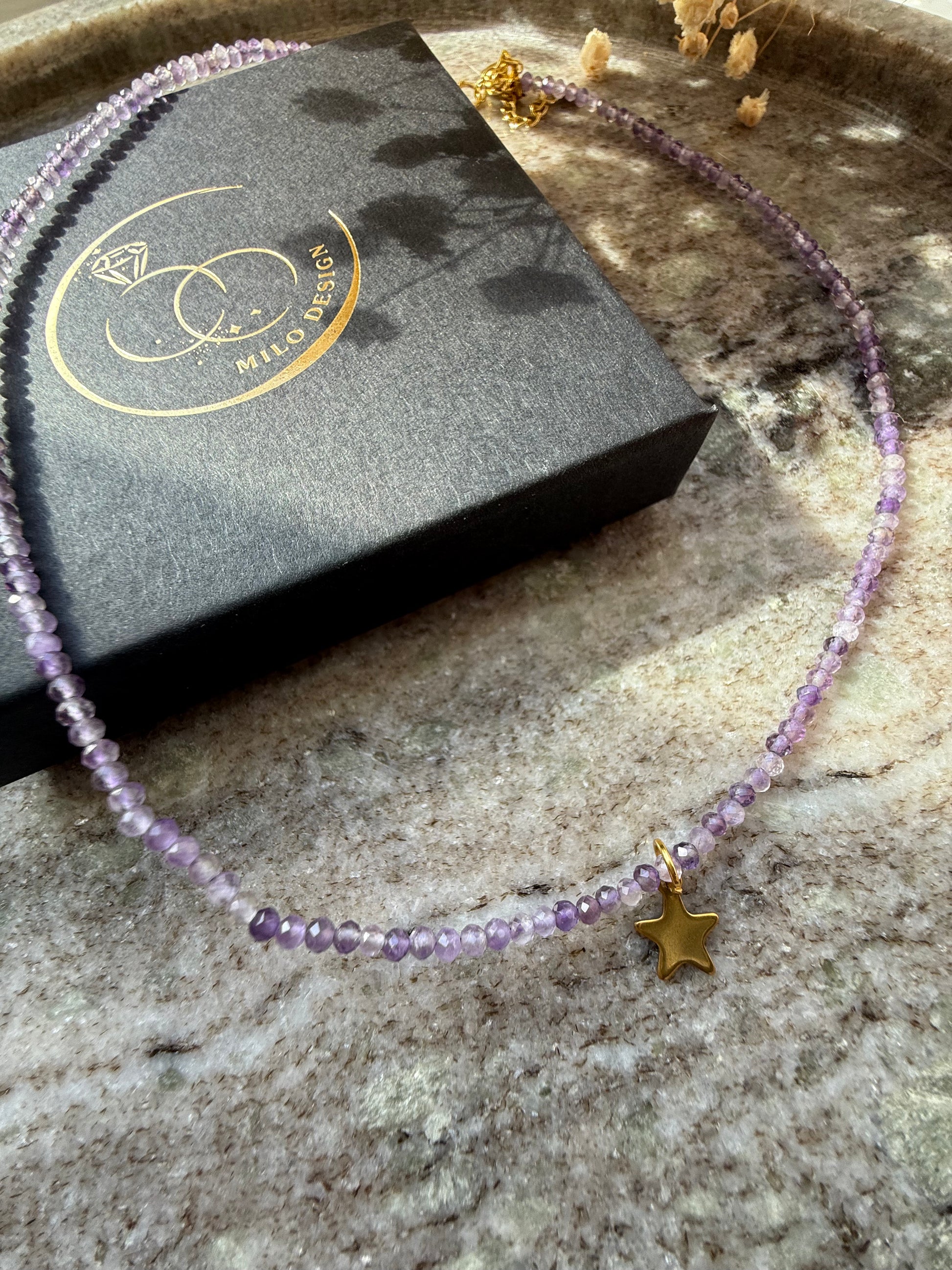 💓Naszyjnik z ametystu z zawieszką w kształcie złotej gwiazdki – Harmonia, spokój i subtelny blask