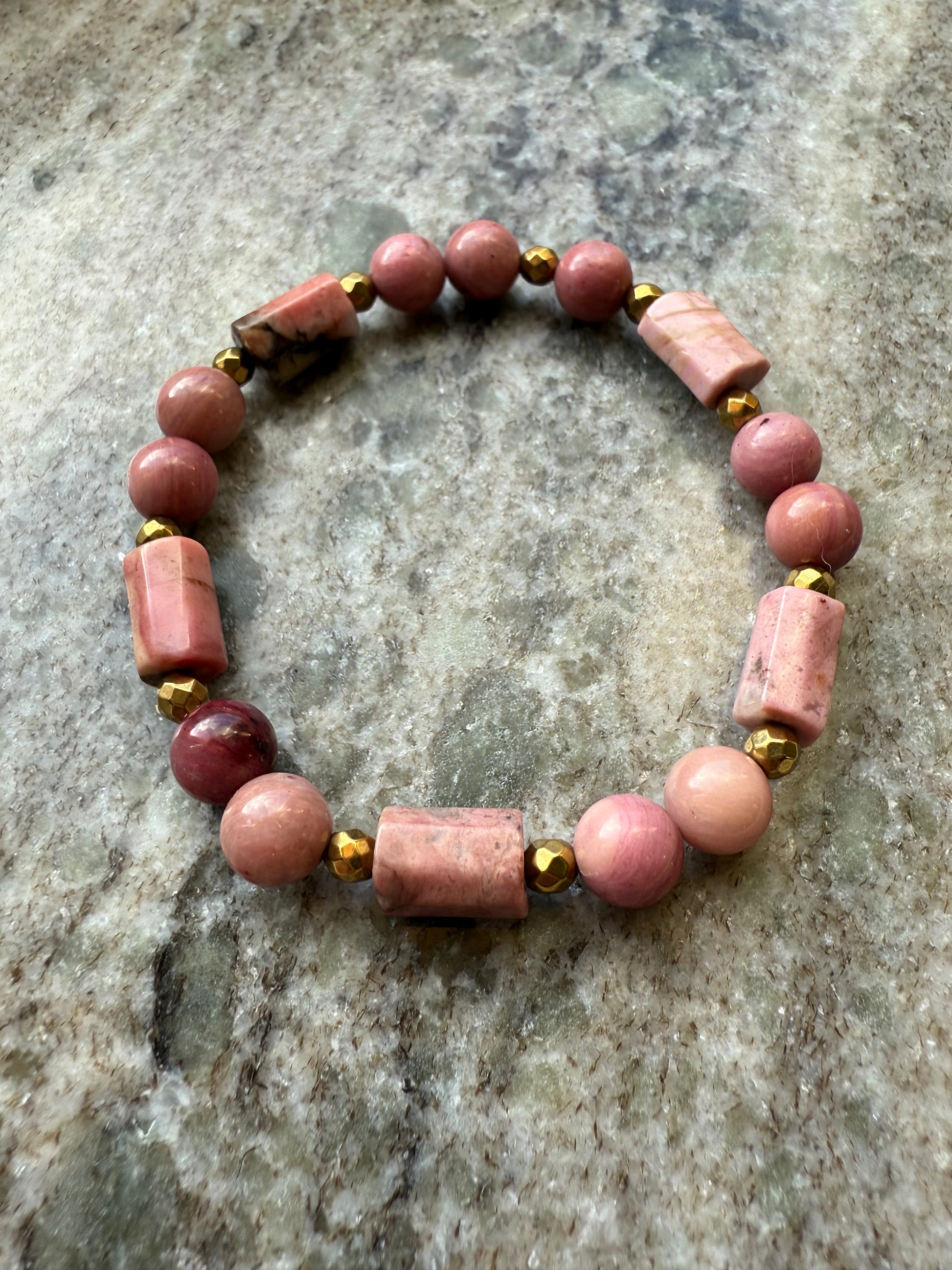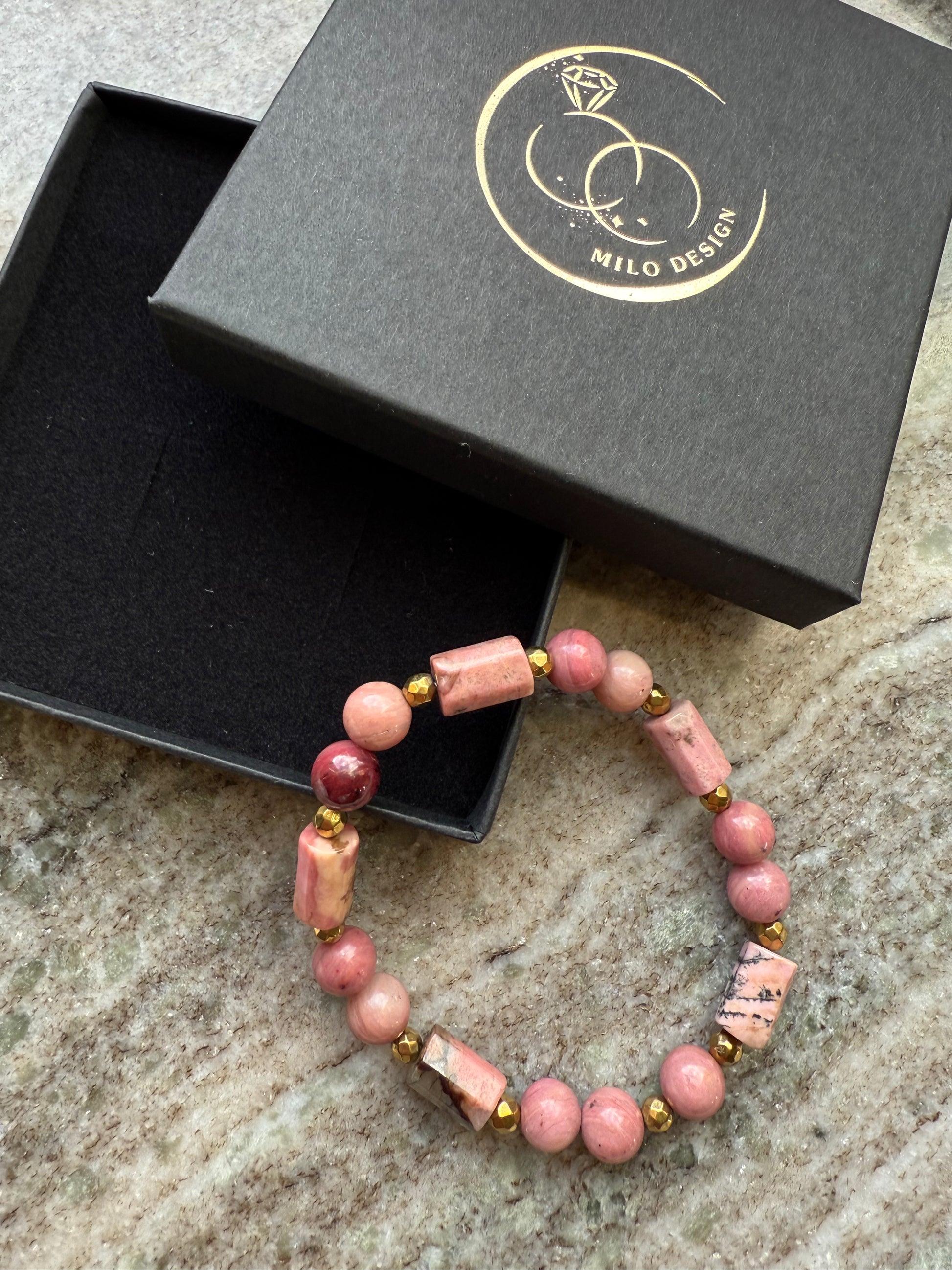 Ta wyjątkowa bransoletka łączy w sobie siłę i delikatność naturalnego rodonitu, prezentowanego w postaci kulek i wałków. Subtelna, różowa tonacja rodonitu harmonijnie współgra z luksusowym blaskiem złotych kulek hematytu, tworząc unikalny, energetyzujący design. Starannie dobrane materiały oraz precyzyjne wykonanie gwarantują, że biżuteria ta przyciąga wzrok i podkreśla indywidualny styl.