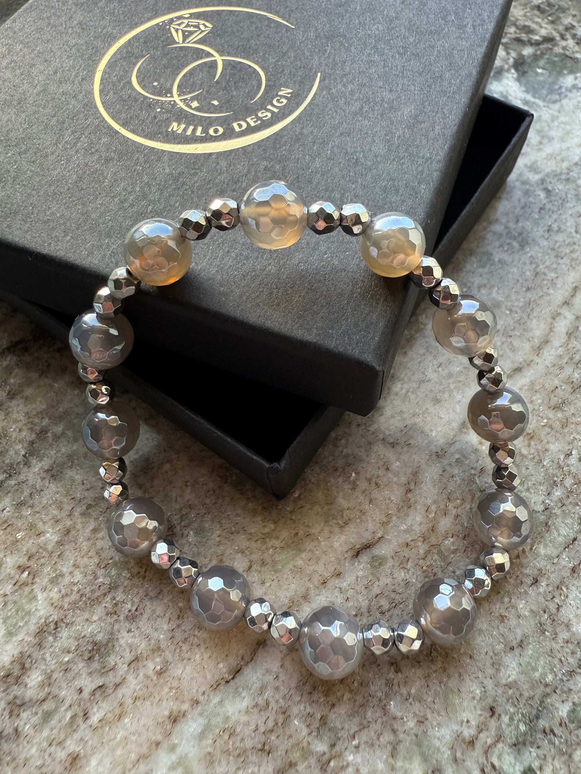 Bransoletka „Silver Agate” – Galwanizowany Agat Szaro-Srebrny z Hematytem