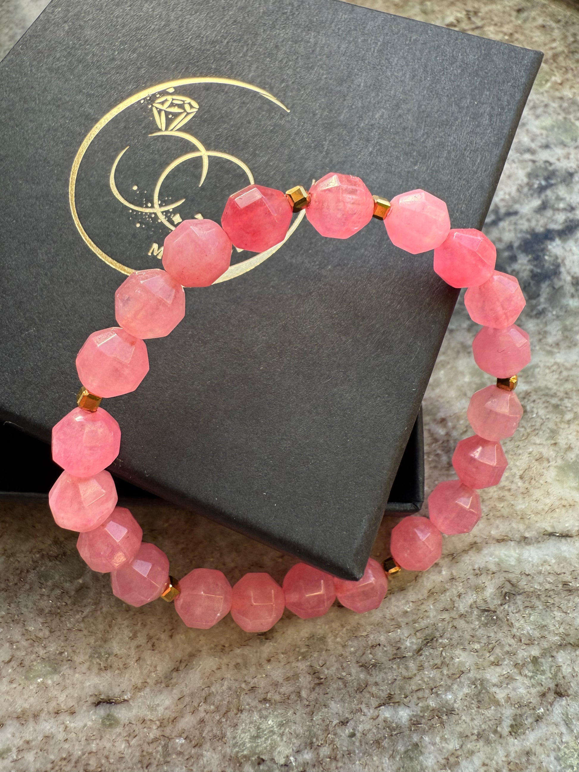 Dodaj subtelnej elegancji do swojej kolekcji dzięki bransoletce „Golden Rose”, wykonanej z naturalnego różowego agatu i ozdobionej złotymi hematytami. To wyjątkowa biżuteria, która łączy delikatność pastelowych odcieni z luksusowym blaskiem złota, tworząc harmonijną kompozycję dla kobiet ceniących styl i energię naturalnych kamieni